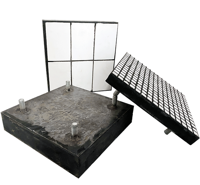 即陶瓷和橡膠二合一板,將特殊的陶瓷片通過硫化工藝嵌入特種橡膠內,形成方形的耐磨橡膠陶瓷復合體,然后通過焊接或粘貼固定在設備的內殼鋼板上,以形成堅固而緩沖的耐磨層。